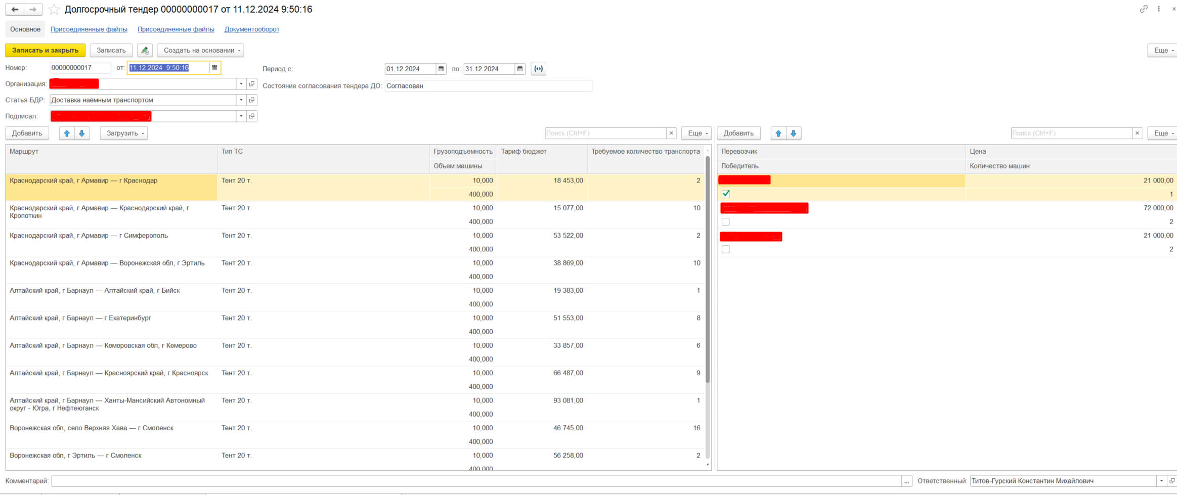 Автоматическая загрузка результатов тендеров в «1С:Транспортная логистика, экспедирование и управление автотранспортом КОРП».