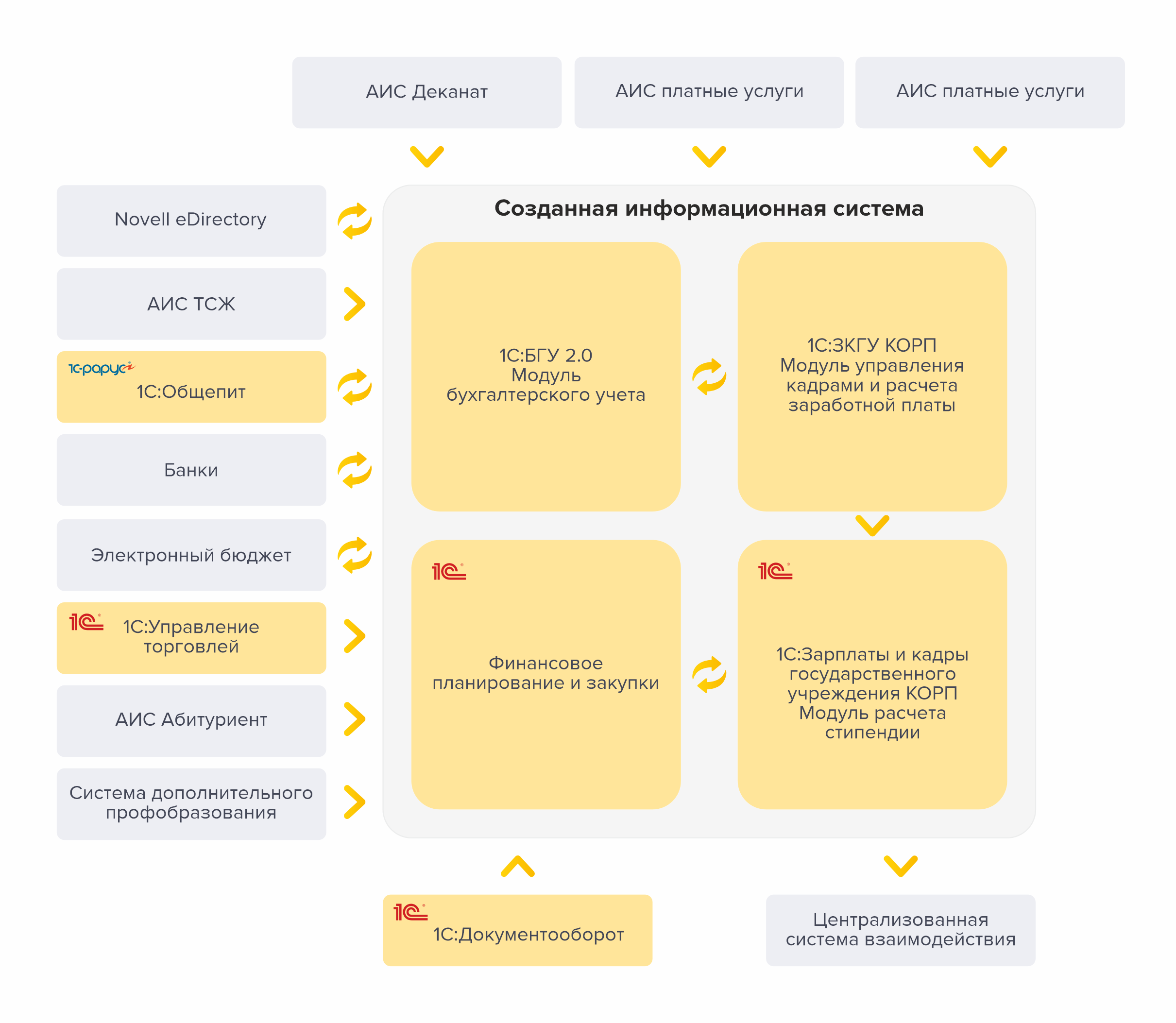 Специалистами «1С‑Рарус» разработаны и реализованы интеграции, соответствующие требованиям университета: