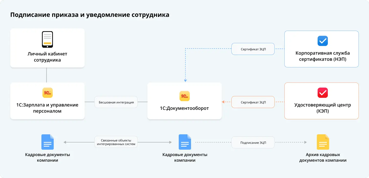 - В 1С:Документообороте создается новый документ — приказ, который автоматически связывается с исходным заявлением/служебкой. Приказ отправляется на электронную подпись (руководителю, кадровику или сотруднику, если требуется).