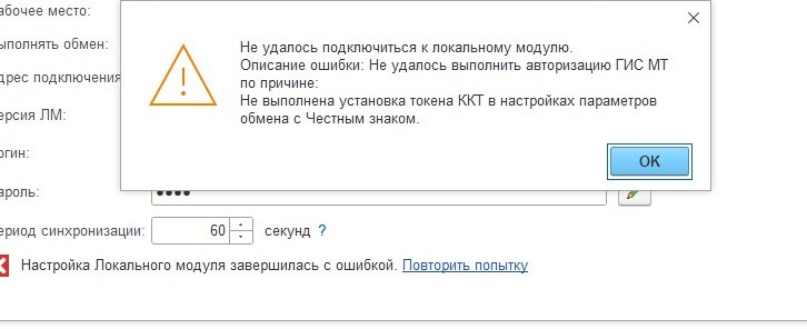 Создал идеальные условия - компьютер, ФР подключён к компьютеру, установил локальный модуль ЧЗ, но ошибка та же "Не выполнена установка токена". Это означает, что нет обмена между АА и ЧЗ? Подключение к СУЗ настроено корректно, или это что-то другое?