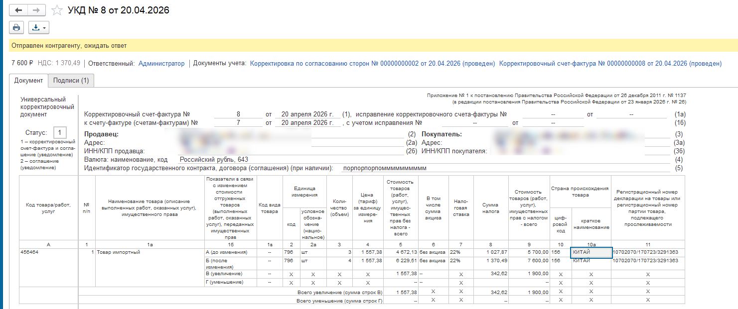 Мы формируем документы ЭДО в АА. Если выгружать УКД через Еще-ЭДО-Выгрузить документ в файл, тогда все корректно в файле, есть нужные тэги. А вот если через ЭДО-просмотреть ЭД или отправить ЭД, то заполняет не корректно. Там как я понимаю немного разные алгоритмы работают. Мы повторюсь отправляем через встроенный ЭДО Калуги из АА.