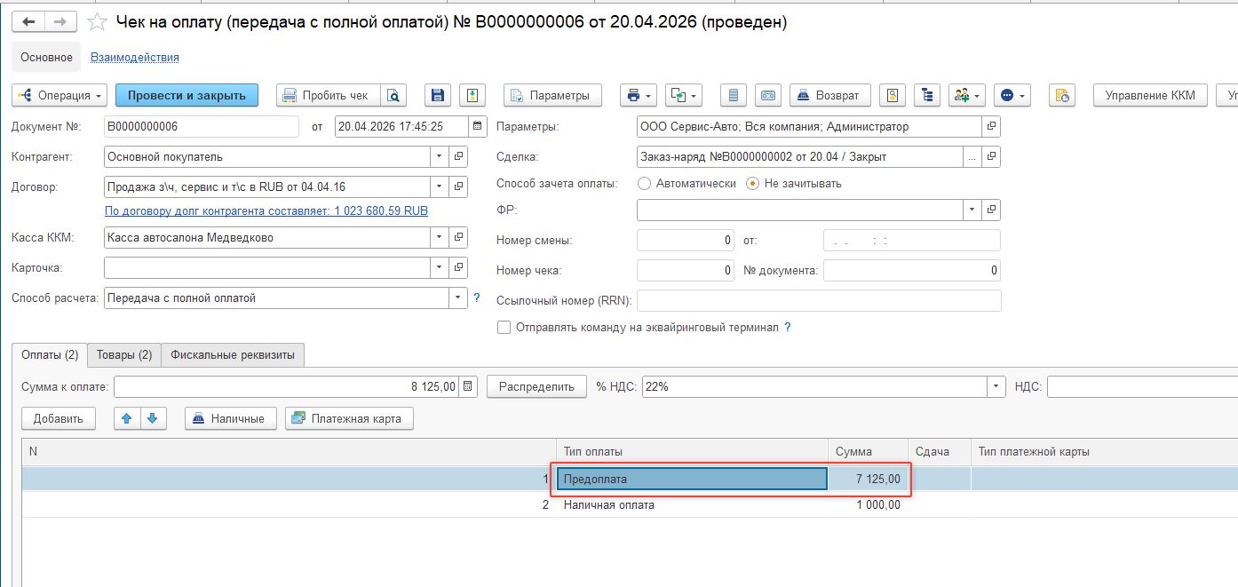 подобная ситуация наблюдается и с оплатами. Клиент заказал деталь (заказ и резервирование), внес по нему предоплату 50%, на основании заказ поставщику, потом поступление. Когда товар пришел сделали заказ-наряд (или заявка на ремонт потом заказ-наряд - тут уже не важно). Отработали заказ наряд, но при попытке создать чек на оплату оставшейся суммы - выходит ошибка "Сумма товарных позиций больше суммы оплат. Для способа расчета "Передача..." сумма документа должна быть равна сумме товарных позиций." и "Неверно заполнен "Способ расчета". Сумма оплат меньше суммы товаров, способ расчета должен быть "Передача с частичной оплатой"."