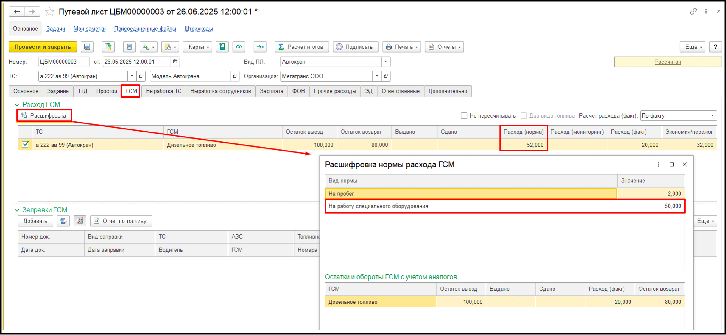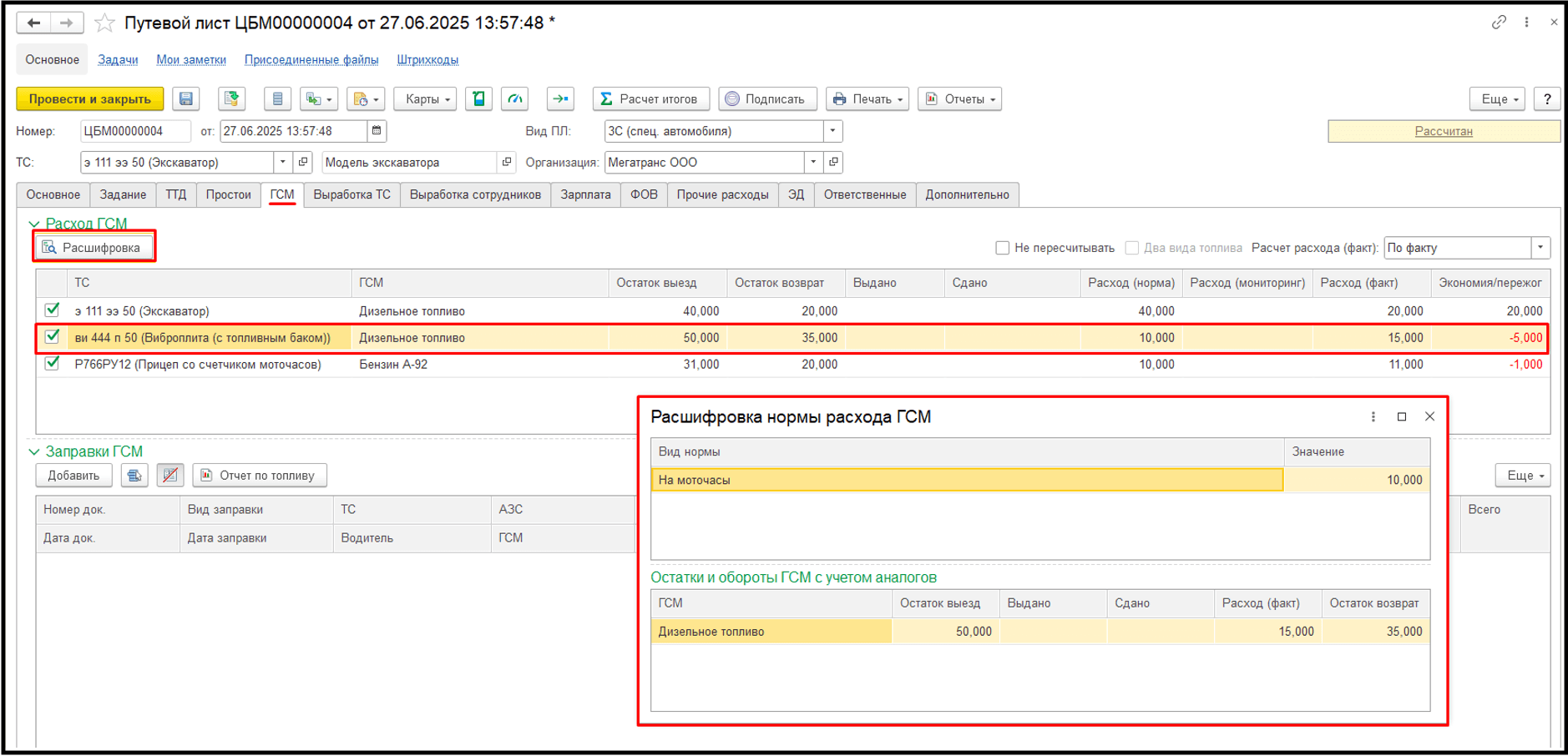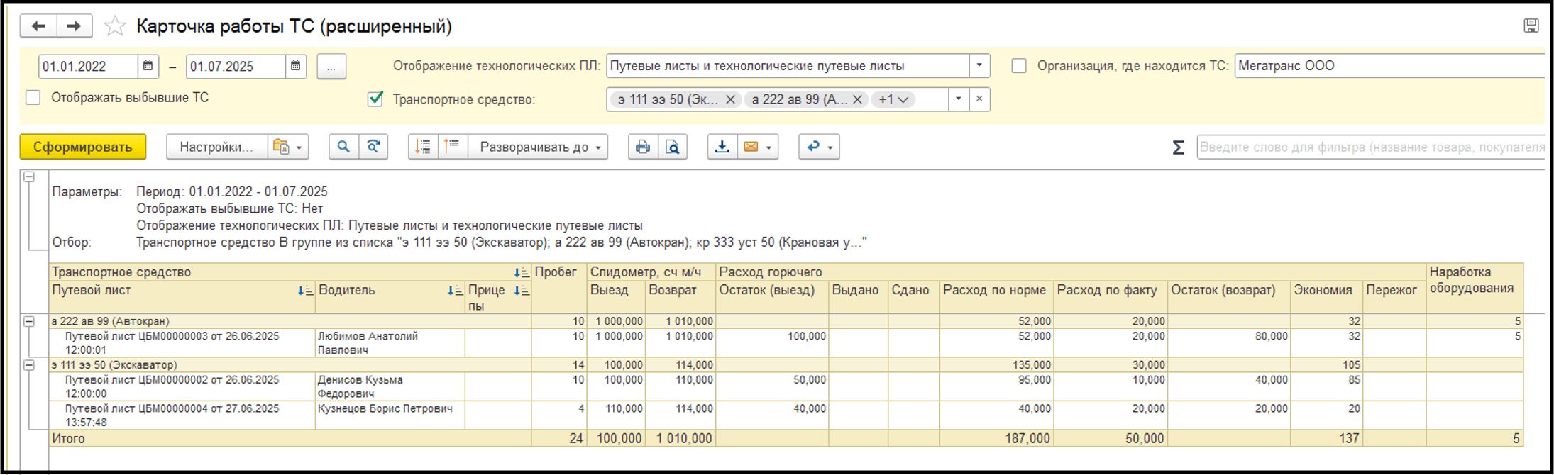 - Учет ГСМ: отслеживание расхода топлива и смазочных материалов по каждой единице техники.