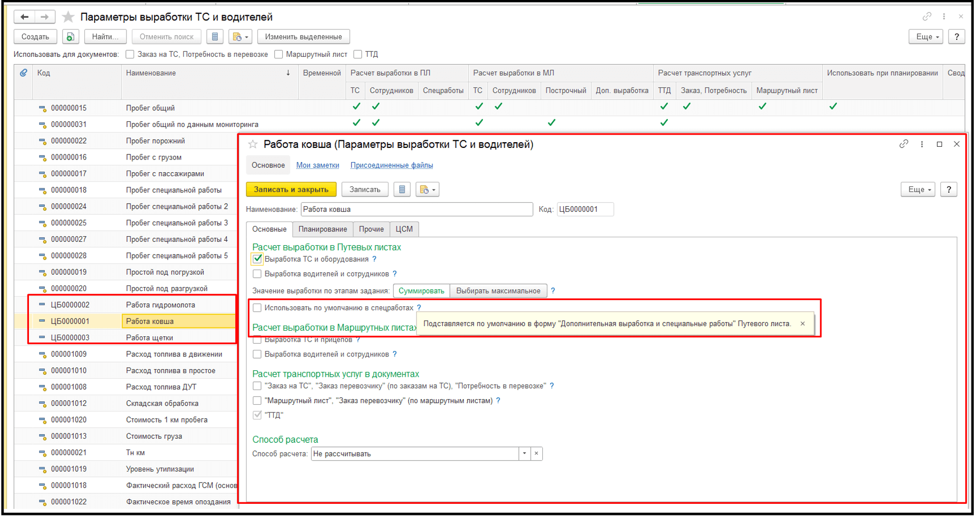 Во многих случаях требуется вести учет не только по основному транспортному средству, но и по навесному оборудованию (ковши, гидромолоты, траншеекопатели, сеялки и т.п.). В программе предусмотрено два способа учета: через отдельное транспортное средство или через специальные работы.