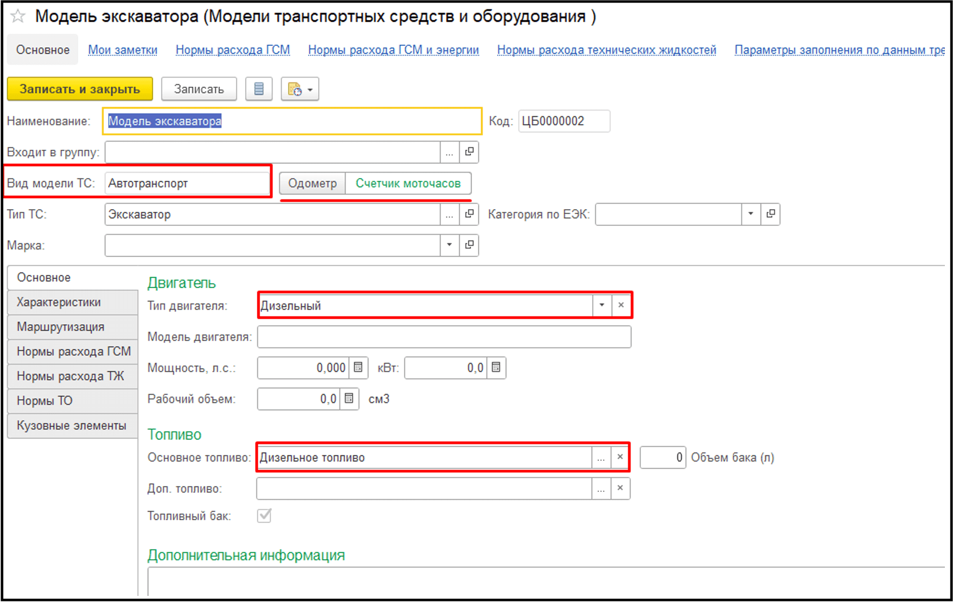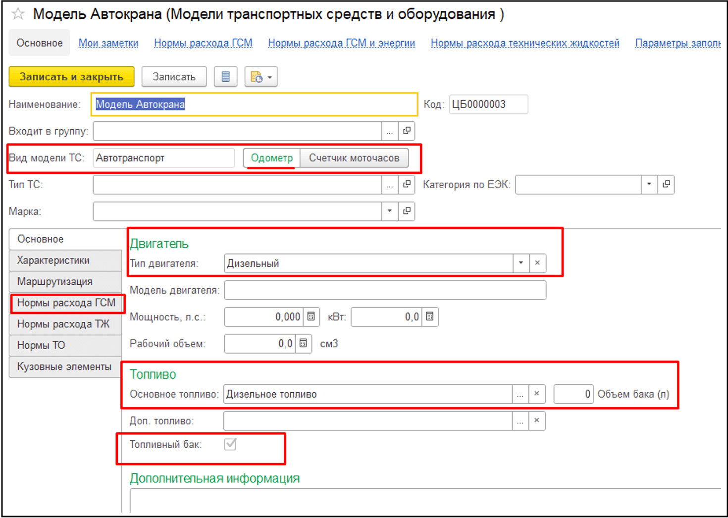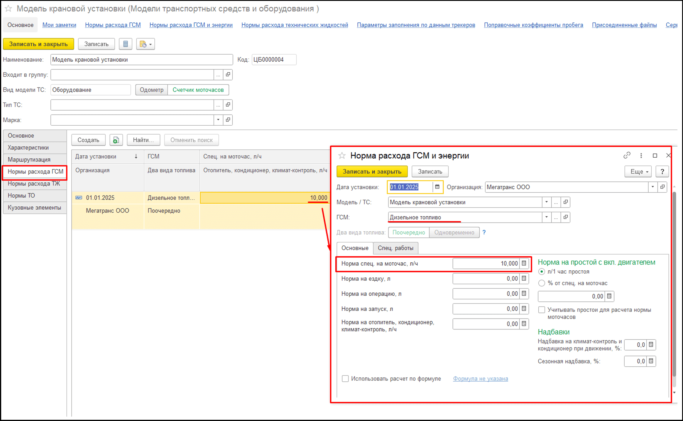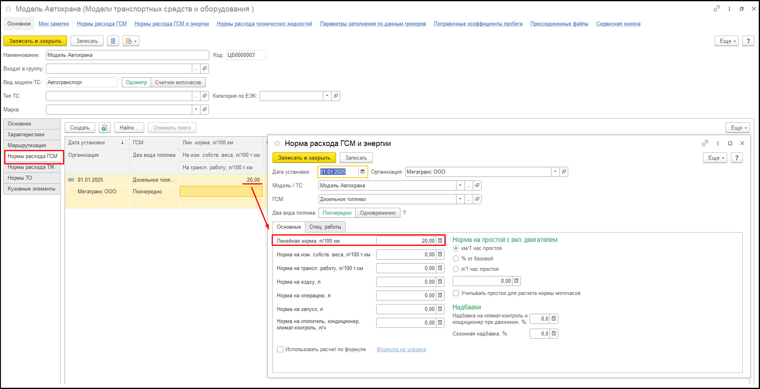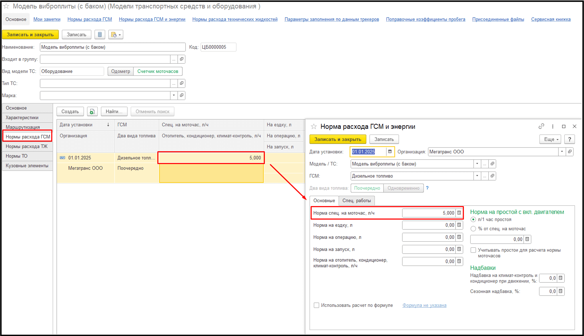 - Нормы расхода ГСМ, как для основного транспортного средства, так и для навесного оборудования, в версиях ПРОФ, КОРП и Модуль для 1С:ERP можно указывать как в модели ТС, так и в карточке самого транспортного средства. В версии Стандарт нормы задаются на уровне модели.