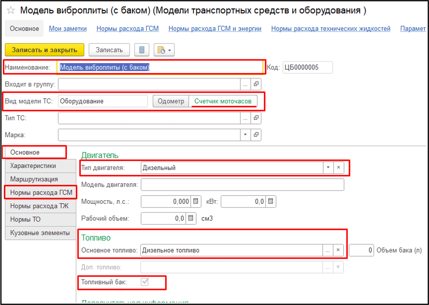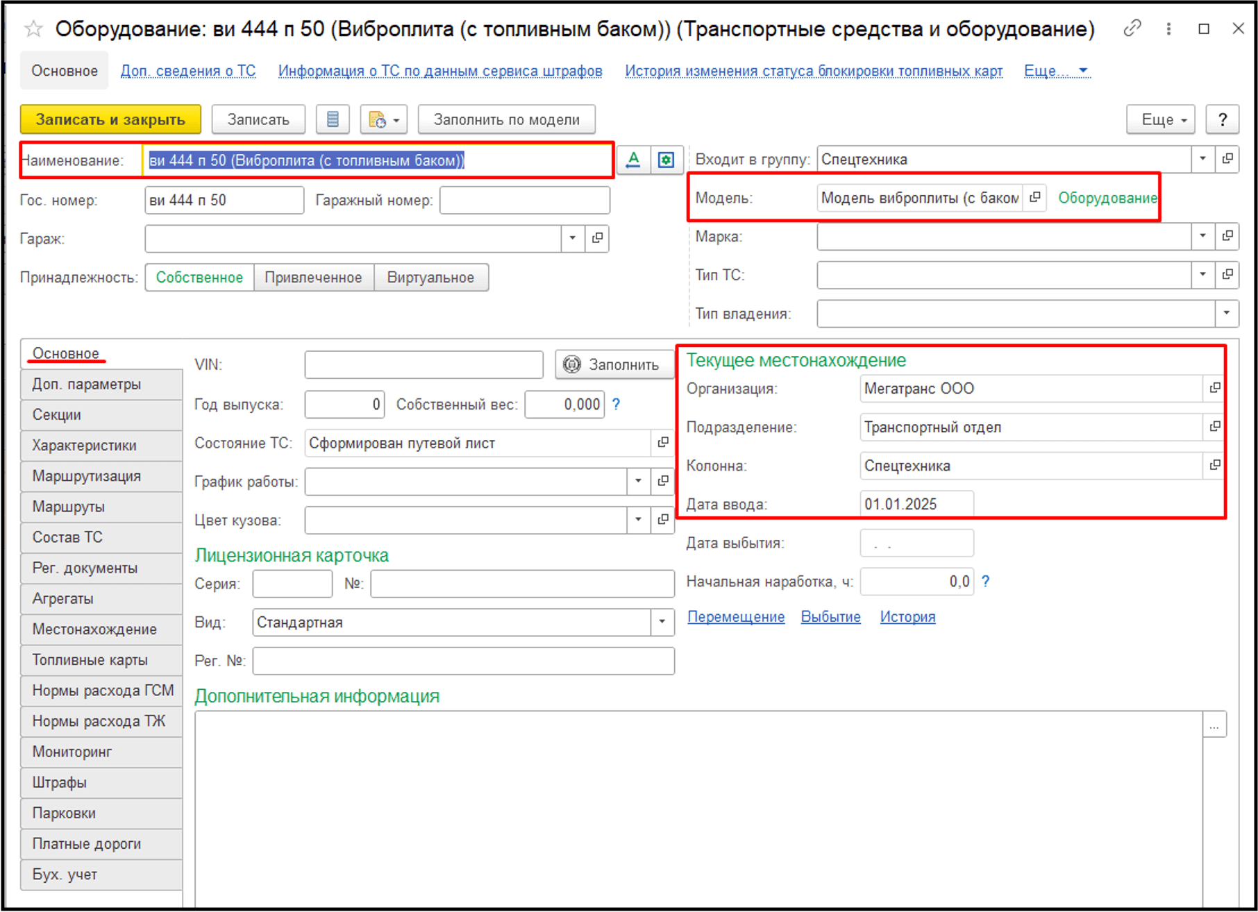 1.2. Рассмотрим оборудование с собственным топливным баком, которое учитывается как отдельное транспортное средство (пример — виброплита). Для этого необходимо: