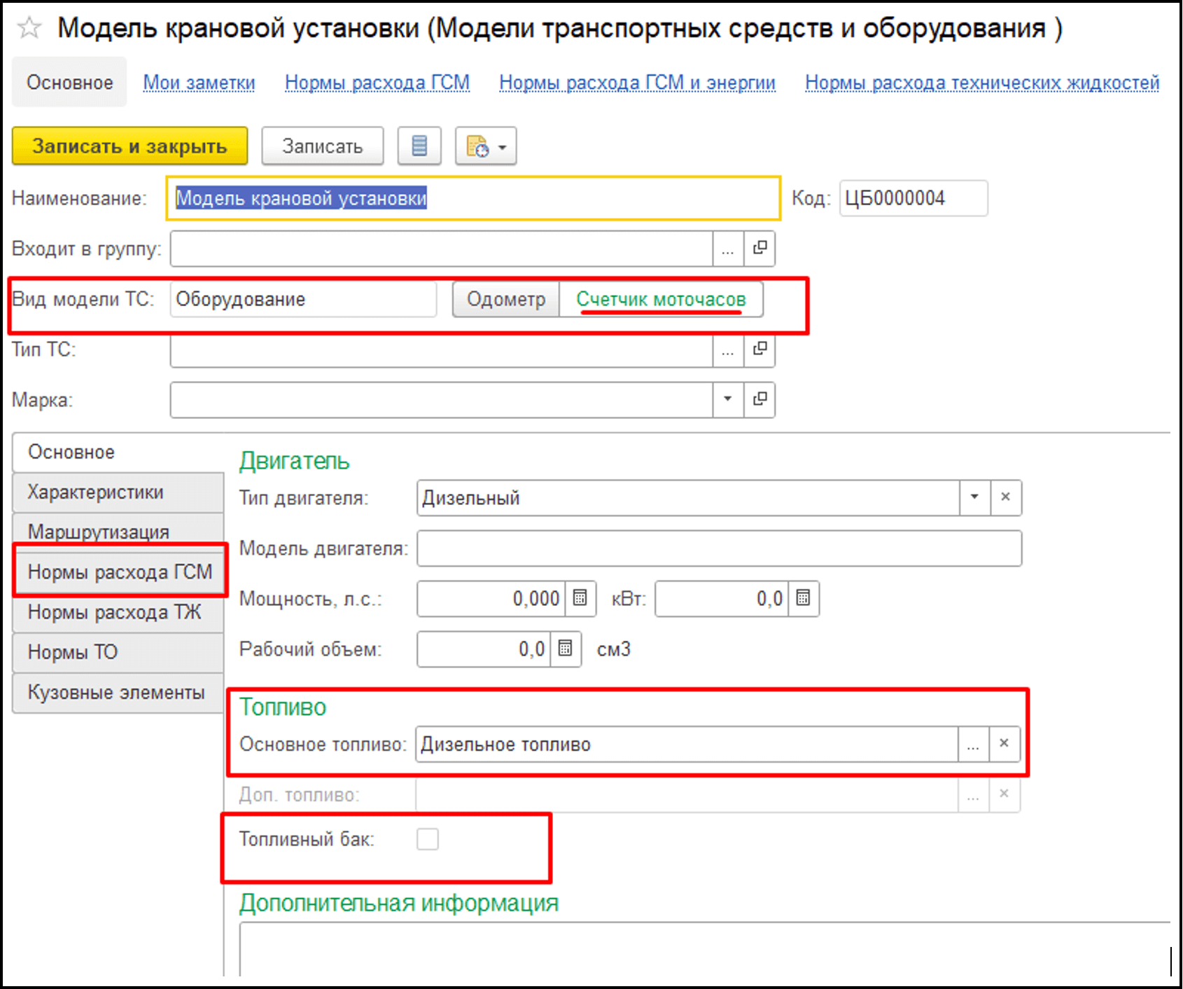 - В модели оборудования которое имеет свой топливный бак установите признак «Топливный бак».