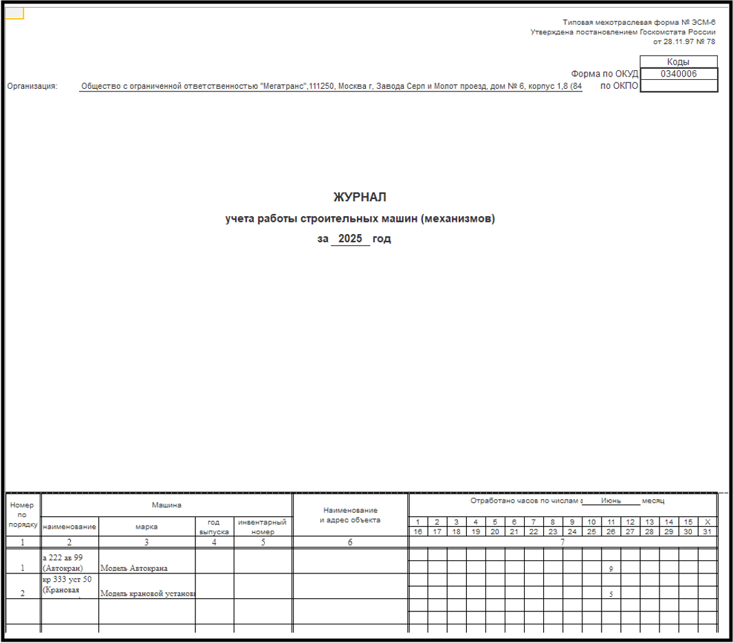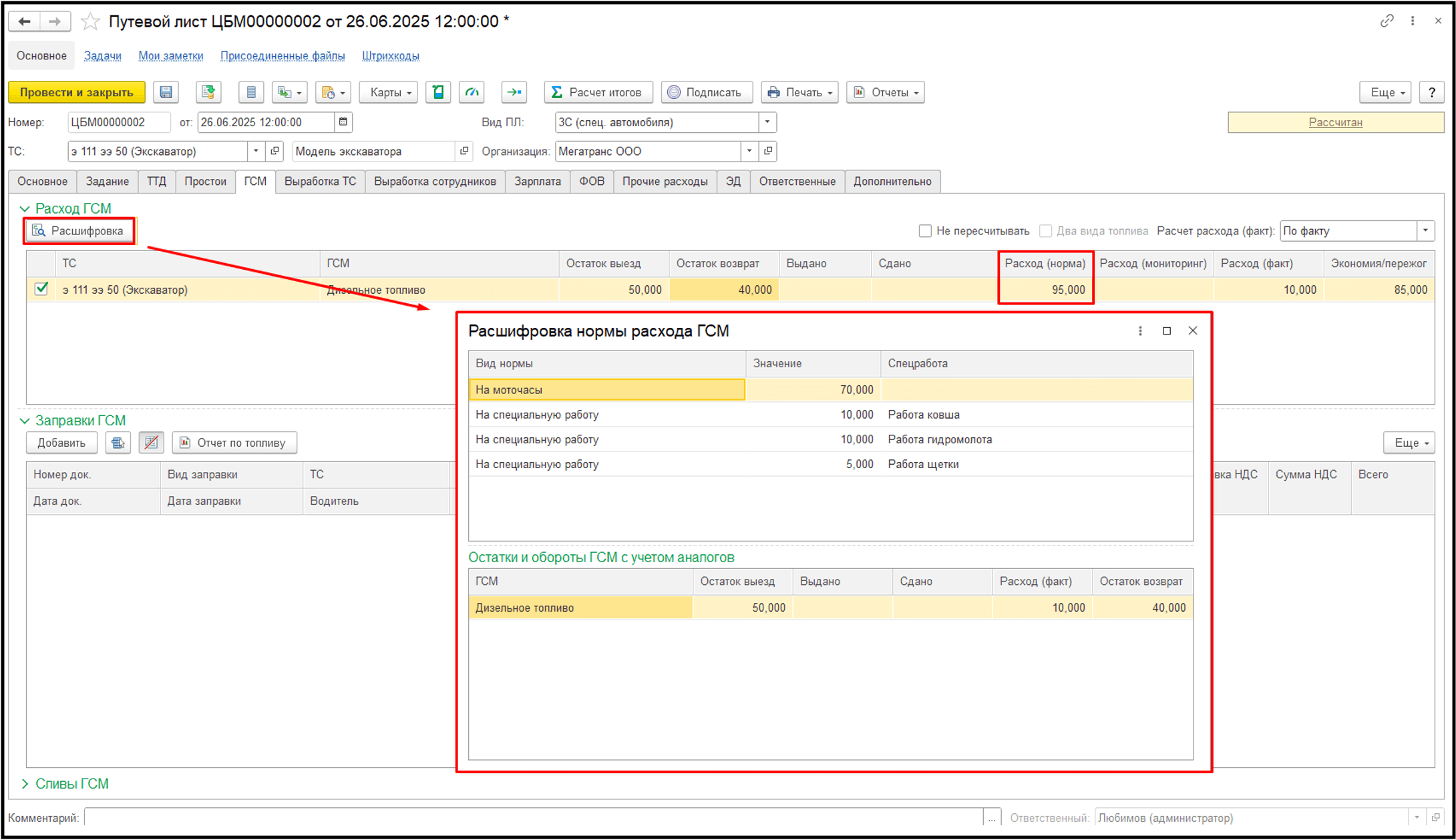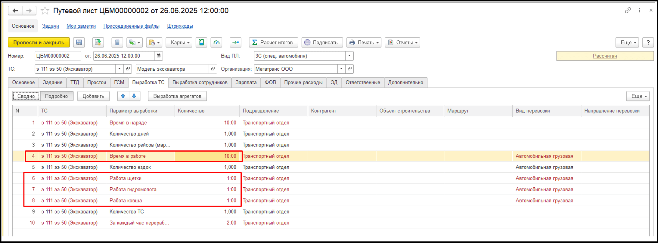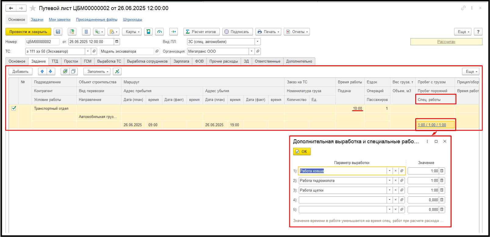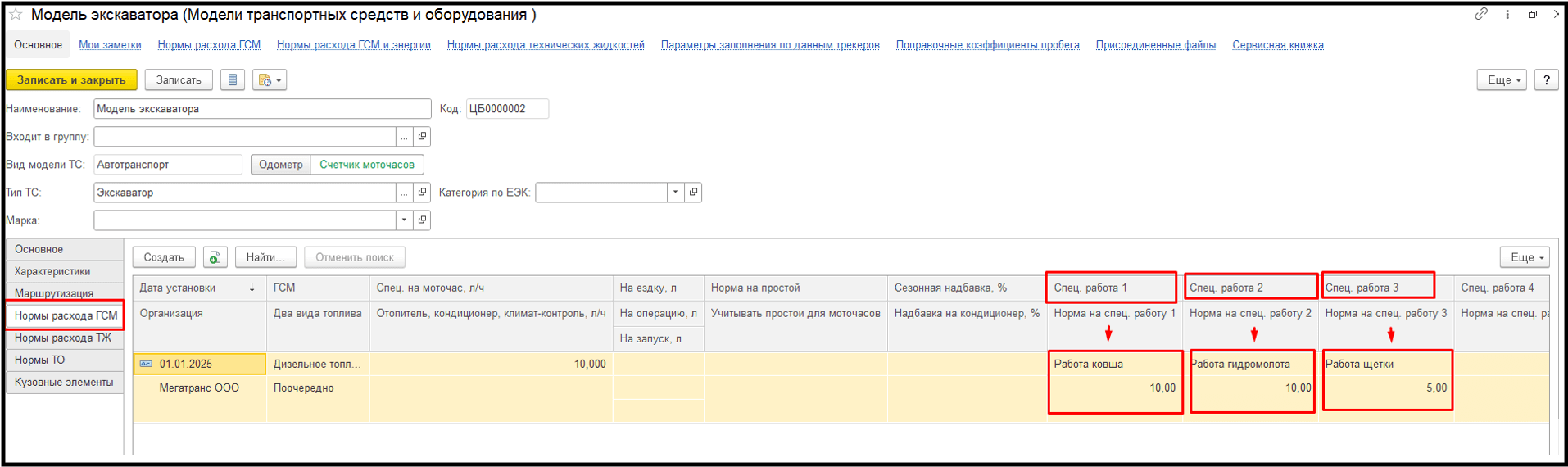 Работу подобного оборудования (включая выработку и расход ГСМ) можно отражать с использованием спецработ. Например, для экскаватора необходимо: