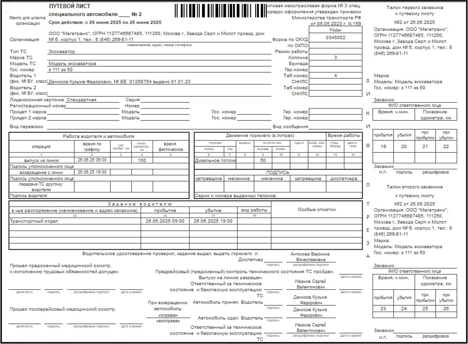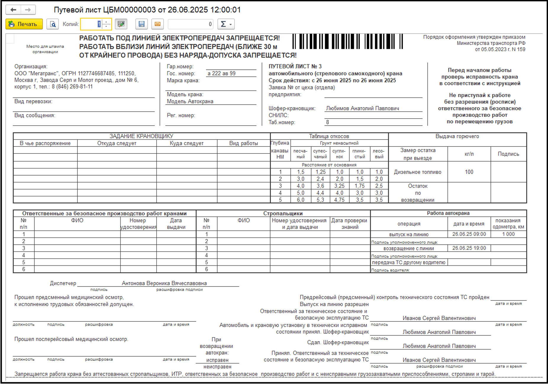 - Маршрутные листы: поддержка оформления маршрутных листов для транспортировки материалов и оборудования.