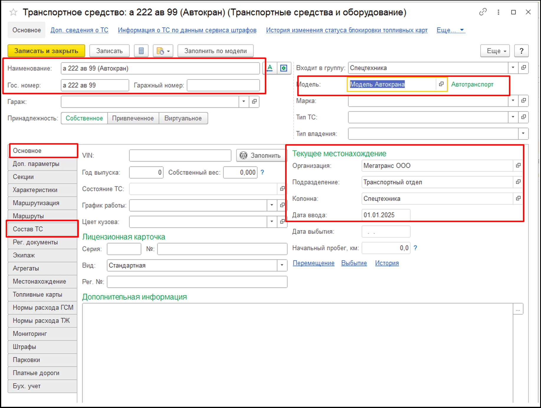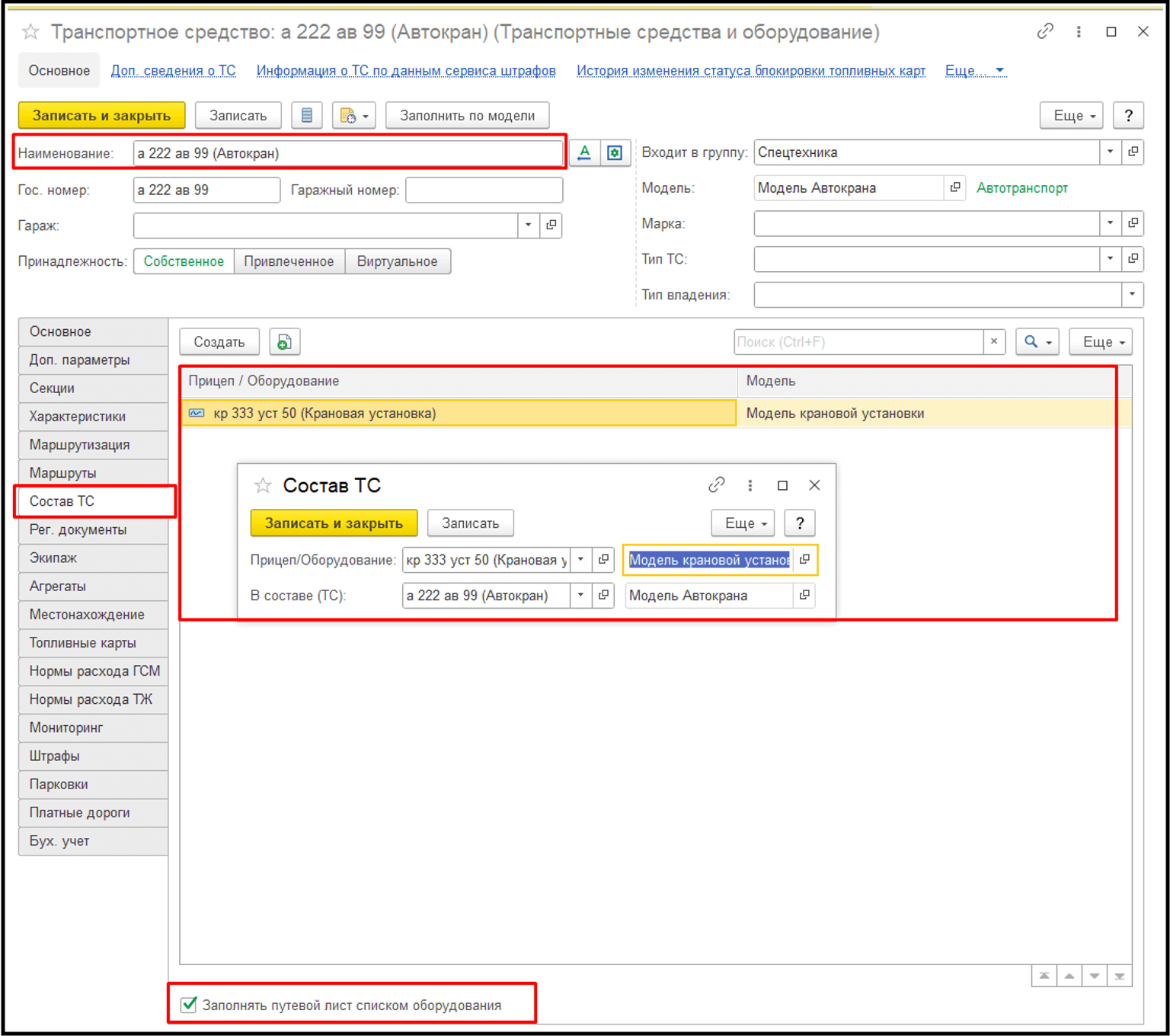 Если транспортное средство состоит из частей, каждая из которых может работать отдельно, для корректного учета создаются отдельные элементы справочника «Транспортные средства». Например, для автокрана: