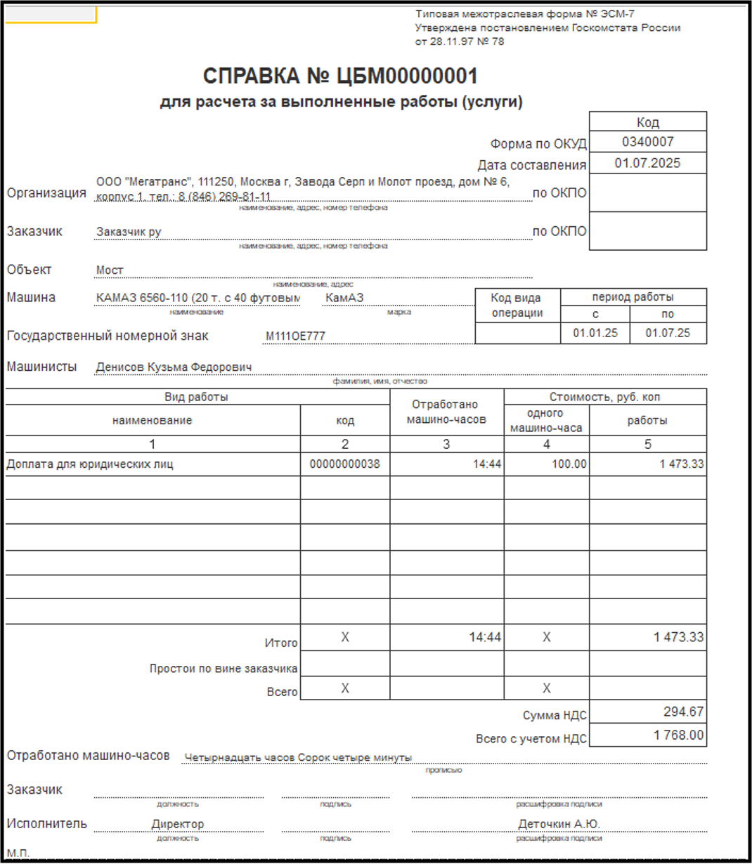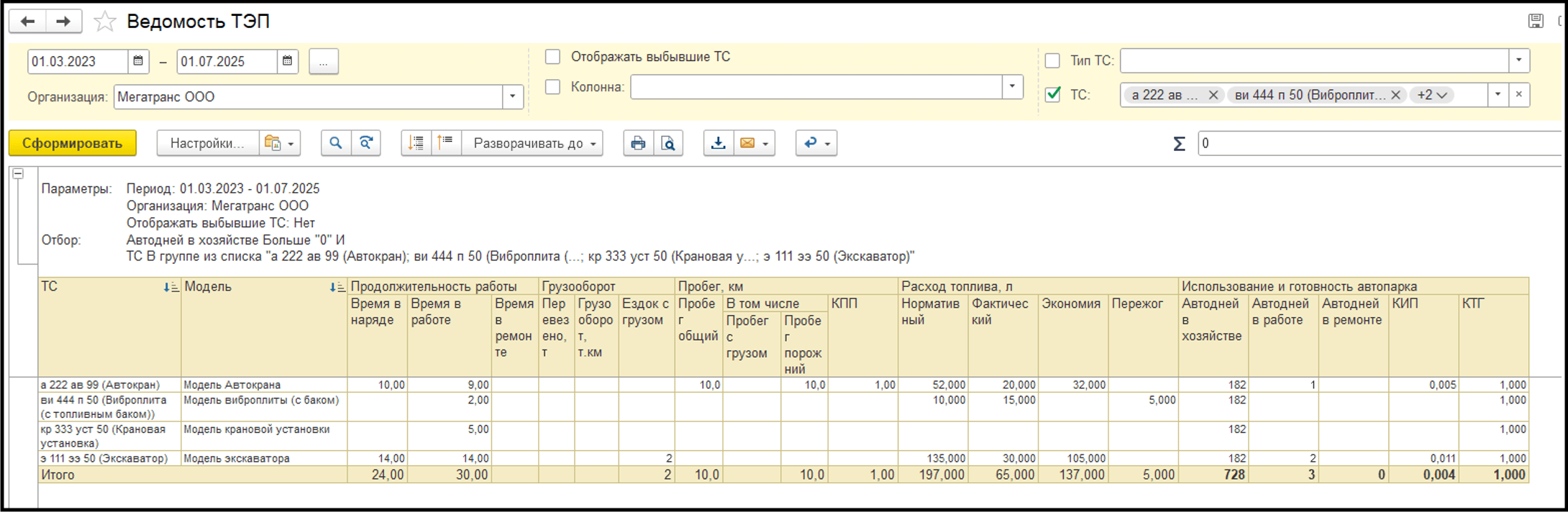 Для оценки эффективности использования строительной техники и механизмов в решениях линейки «1С:Управление автотранспортом» предусмотрены аналитические отчеты. Среди них — «Выработка ТС по Путевым листам», «Пробег ТС», «Наработка оборудования в моточасах», «Карточка работы ТС», «Реестр на выписку счета», а также форма «Акт КС-3» (доступна во всех версиях, кроме Стандарт). Кроме того, реализована печать журналов учета по формам «ЭСМ-6» и «ЭСМ-7» за выбранный период (также за исключением версии Стандарт).