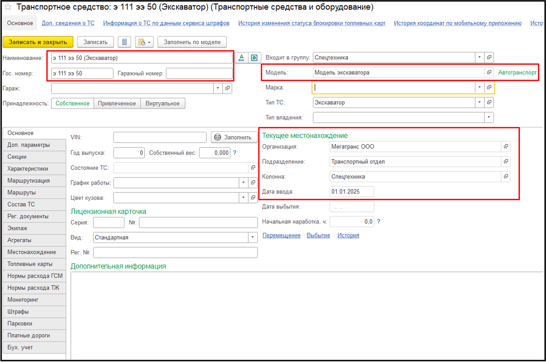 Если оборудование работает только на месте, доставляется другим транспортом и его учет ведется по моточасам, оно отражается в системе как отдельное транспортное средство. Пример: виброплиты, бетономешалки, генераторы, сваебойные установки, компрессоры.
