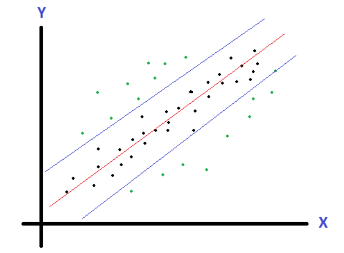 Красная линия — это среднее значение, или центр масс наших данных. Синие линии — это доверительный интервал наших данных. Доверительный интервал — это приблизительный диапазон значений, который с высокой степенью вероятности включает все данные. Черные точки — данные, которые принадлежат доверительному интервалу. А вот зеленые точки — это шум, маргиналы, которые вне нашего доверительного интервала. Этот шум при обучении модели будет мешать тренировке. И нужно от него по возможности избавляться. Очень хороший метод — расчет доверительного интервала и выкидывание тех данных, которые вне нашего доверительного интервала.