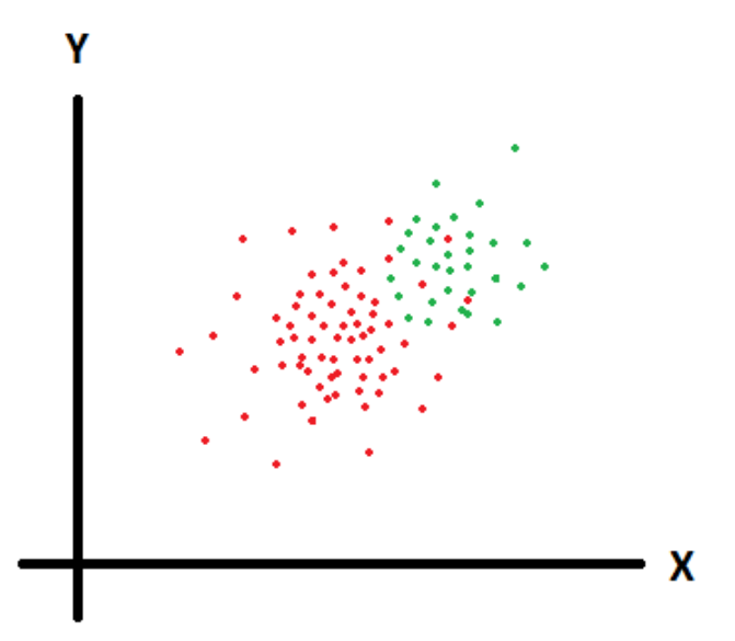 Здесь красными точками обозначены данные, на которых модель была обучена. Зелеными точками обозначены данные, которые стали «поступать» модели, скажем, через три месяца.