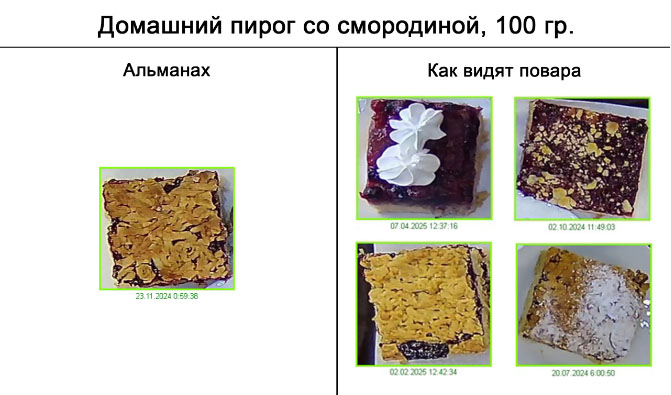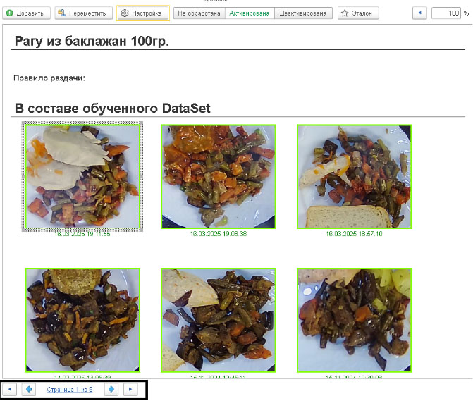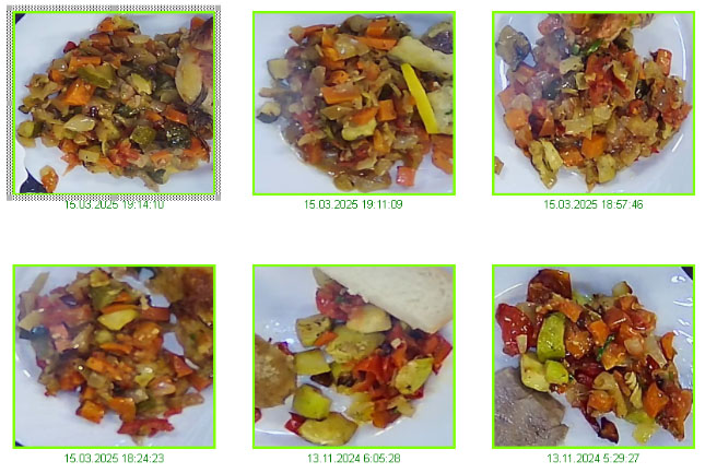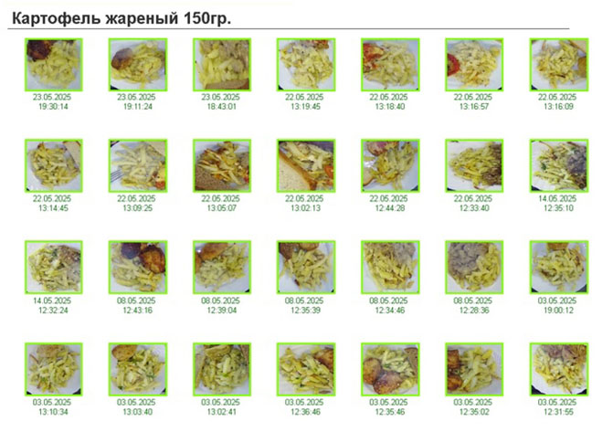 В системе управления машинным зрением поддерживается установка до 5 эталонных блюд. Это позволяет более детально продемонстрировать корректный внешний вид блюда, что, в свою очередь, способствует более качественному решению задачи валидации. Следует отметить, что состав отнесенных к эталону изображений блюд не постоянен. Это может быть обусловлено как сменой повара, так и изменением вида блюда со временем при готовке одним поваром.