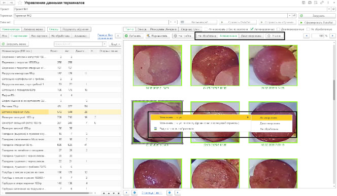 Наличие большого количества изображений по классам способствует более эффективному обучению моделей. Для этого в системе управления машинным зрением реализовано постоянное пополнение состава данных по изображениям классов. Основными источниками поступления изображений являются терминалы. При выполнении операции продажи состав изображений с подноса поступает в систему. Там же данные могут быть загружены вручную. Это необходимо для таких случаев как отсутствие связи с терминалом, загрузки начального блока данных и других.
