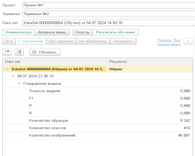 Полученный в результате выполнения обучения на основе датасета файл модели необходим для последующей отправки на терминалы и установки его на них как модели распознавания для промышленной эксплуатации. Полученная модель позволит осуществлять распознавание данных при использовании подносов.