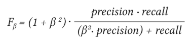 β в данном случае определяет вес точности в метрике. Мы используем β = 1, так как предполагаем, что Precison и Recall имеют одинаковую важность.