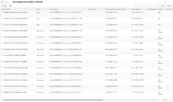 Третий и основной блок данных, получаемый с сообщением об обучении на датасете — это файл модели обучения. Модель представляет собой двоичный файл большого объема. В системе управления машинным зрением хранение моделей организовано с использованием модуля присоединенных файлов библиотеки стандартных подсистем. Элемент справочника, который содержит модель, соотнесен с документом «DataSet».
