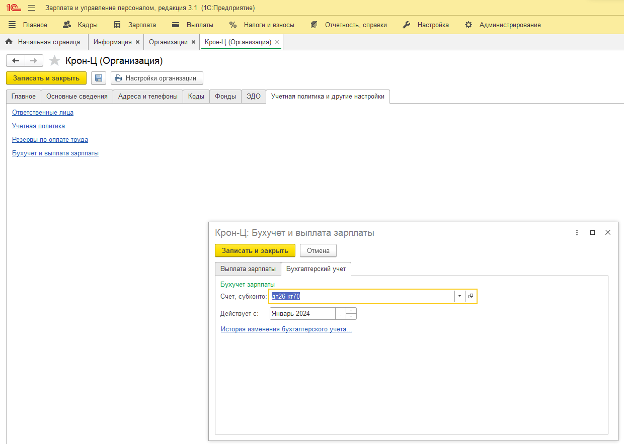 Первый шаг — корректно заполнить учетную политику. В карточке организации на вкладке «Бухучет и выплата зарплаты» задаются счета учета и субконто. Именно они подставляются в документы по умолчанию.