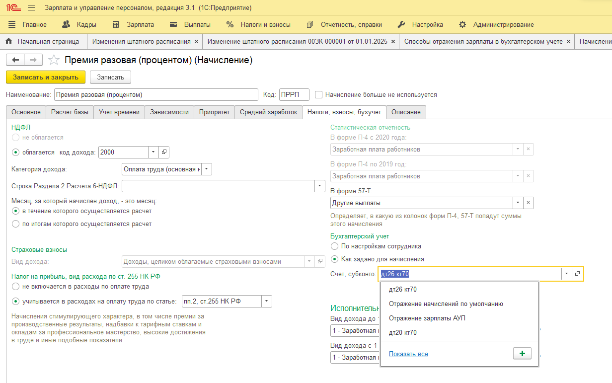 Изменение штатного расписания с выбором счета, субконто.