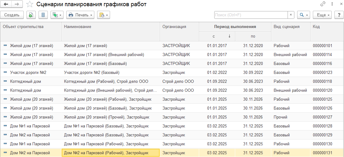 Справочник «Сценарии планирования графиков работ» заполняется работами, выполняемыми на объекте.