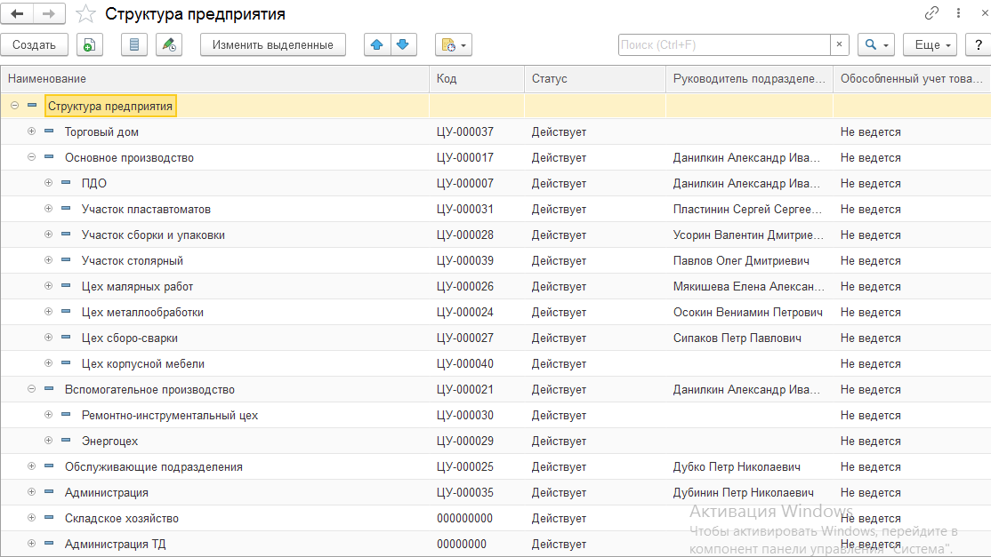 2. «Структура предприятия» — определить состав производственных и строительных отделов.