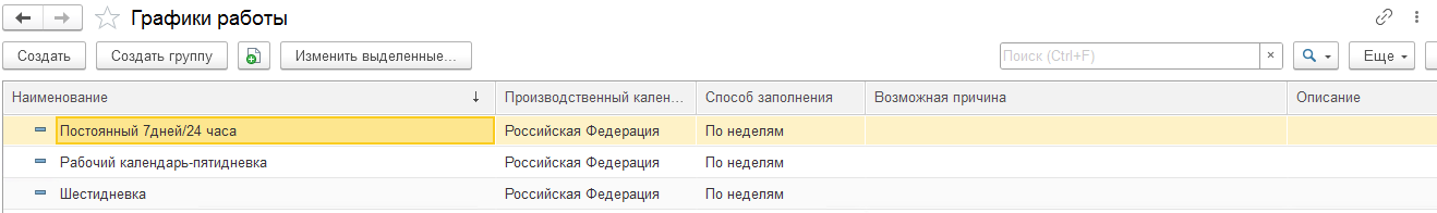 3. «Графики работы» — заполнить производственный календарь, запланировать время начала и окончания смены, определить выходные и праздничные дни.