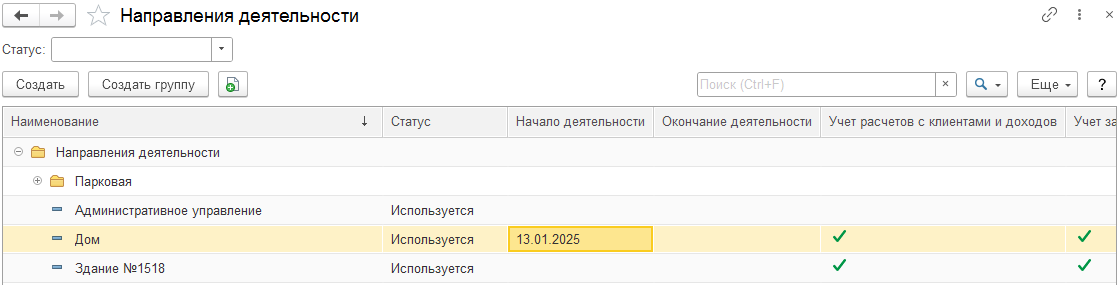 5. «Направление деятельности» — настроить аналитику учета затрат и объектов.
