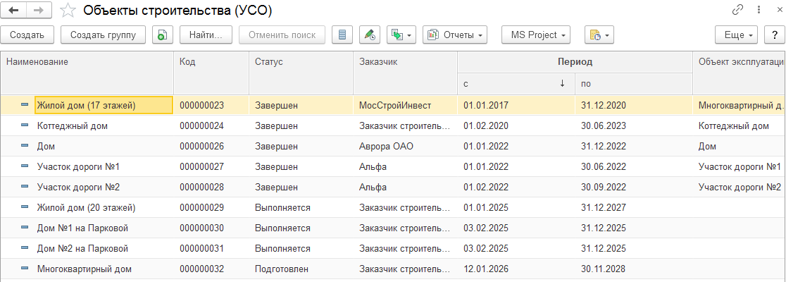В справочник «Объекты строительства» вносится первоначальная информация о будущих проектах.