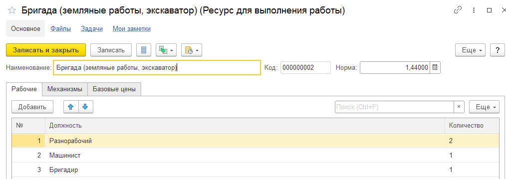 Справочник «Ресурсы для выполнения работ» содержит данные о сотрудниках, транспорте и механизмах для производства строительных работ.