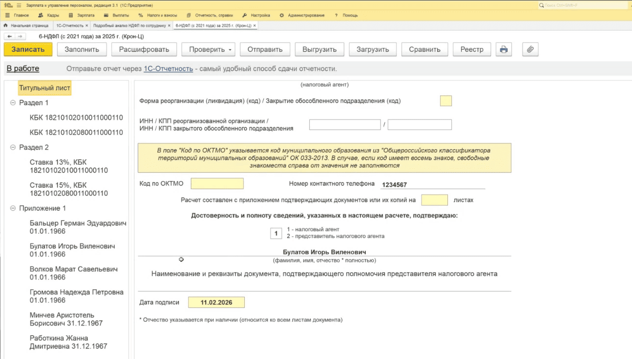 - Повторно сформировать отчет 6‑НДФЛ и выполнить проверку контрольных соотношений.
