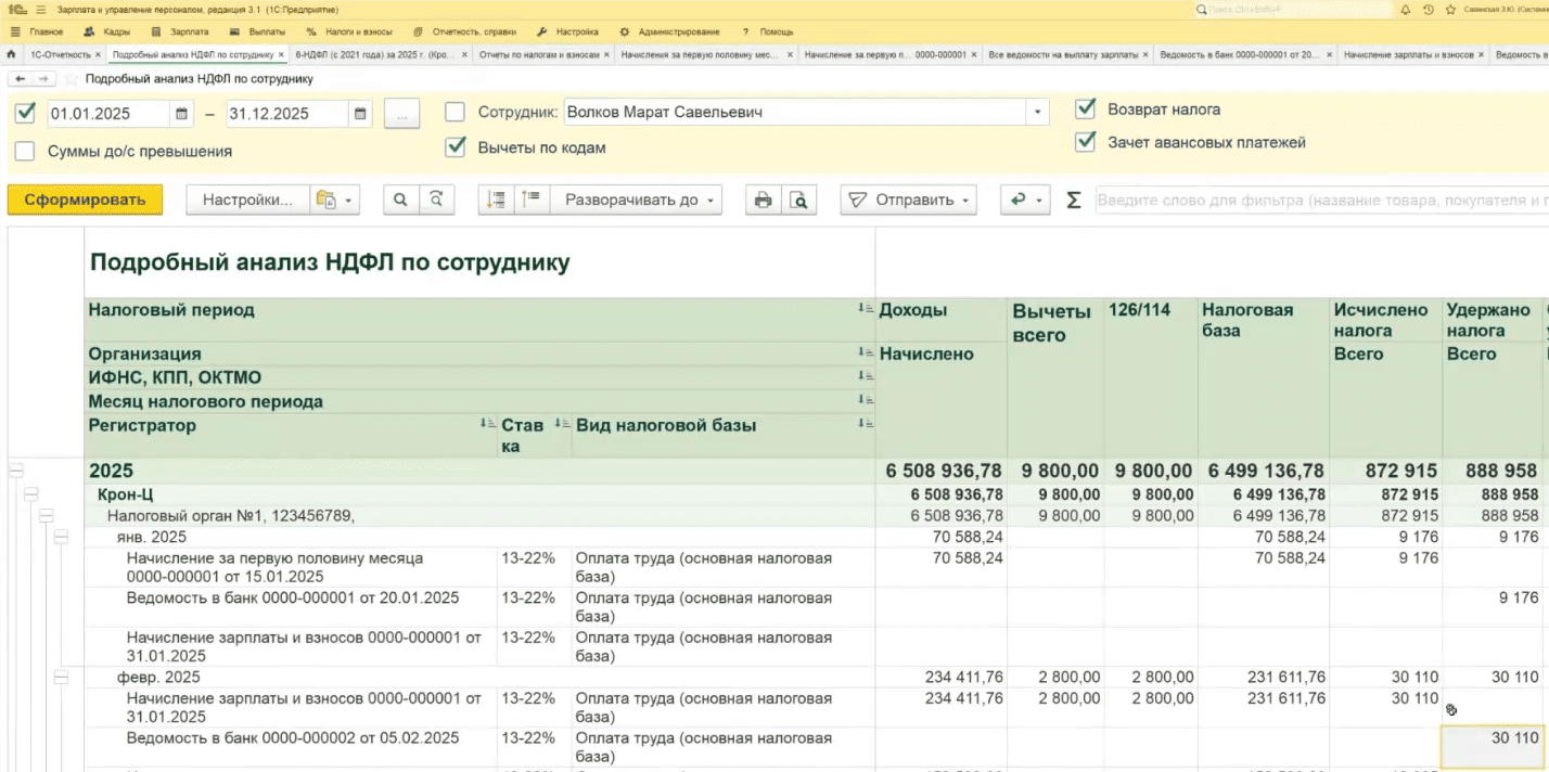 Итог — в «Подробном анализе НДФЛ (по сотруднику)» появляется:
