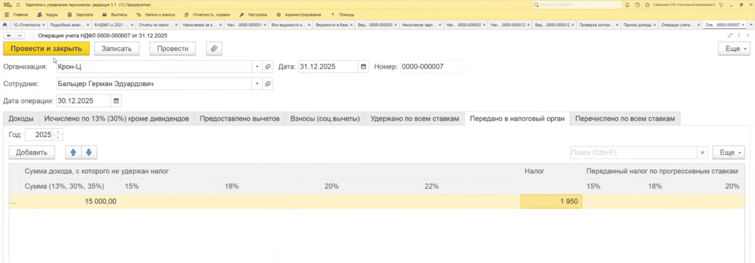 Для отражения такого случая используется документ «Операция учета НДФЛ» с заполнением вкладки «Передано в налоговый орган». В документе необходимо указать: