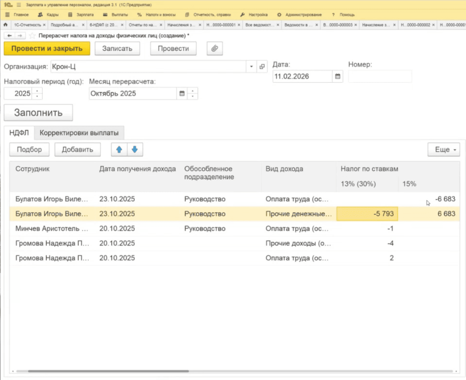 Если ошибка уже закрепилась в проведенных документах и отчетном периоде, исправление выполняется точечно — через корректировку распределения НДФЛ в ведомости на выплату или операцией учета НДФЛ, чтобы привести удержание по ставкам к фактически правильной сумме.