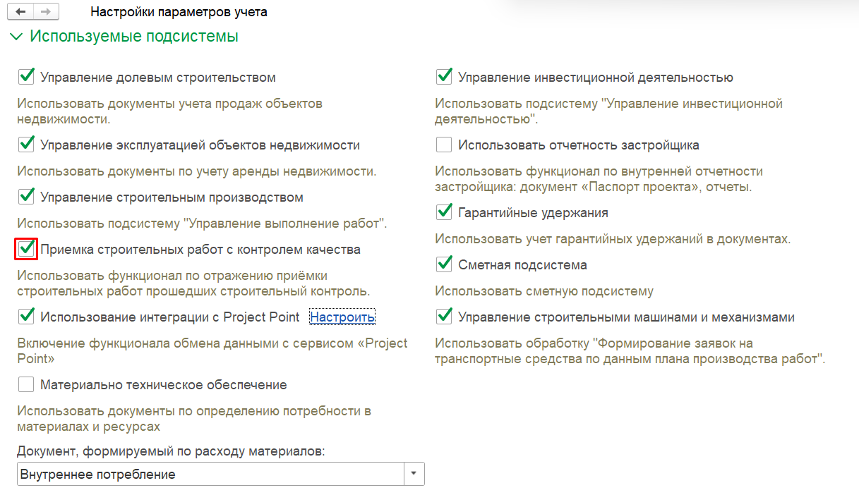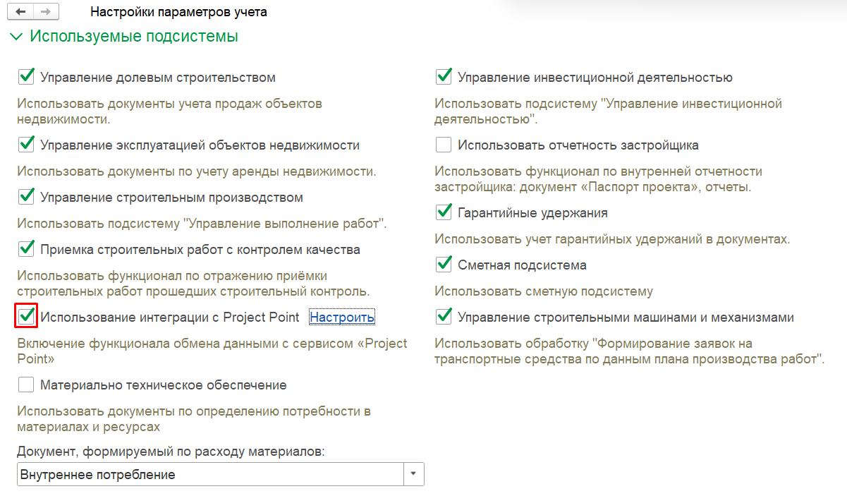 Расширенный — настройка «Использование интеграции с Project Point» для организаций, которые используют в работе или планируют внедрить платформу «Project Point». Активация дает возможность для двустороннего обмена данными — экспорта информации о контроле в 1С:ERP Управление строительной организацией и импорта замечаний из Project Point.