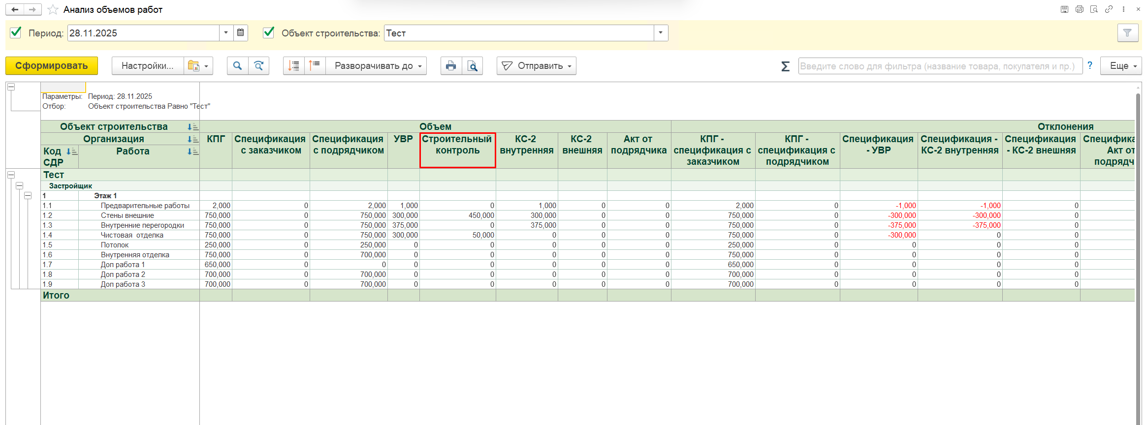 - В документах «Внутренний акт о приемке выполненных работ (КС‑2 внутренняя)», «Акт о приемке выполненных работ заказчиком (КС‑2 внешняя)», «Акт о приемке выполненных работ от подрядчика», в отчете «Анализ объемов работ» добавляется колонка «Строительный контроль» для отражения объемов работ, прошедших контроль качества.