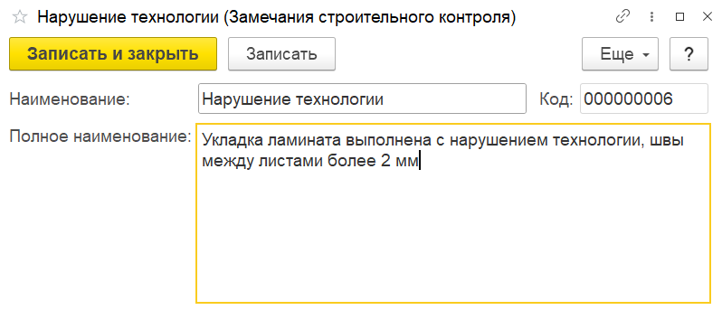 Для стандартизации процесса используется справочник «Замечания строительного контроля», где хранится типовой перечень возможных несоответствий, что значительно ускоряет заполнение документов. Справочник заполняется пользователем вручную.