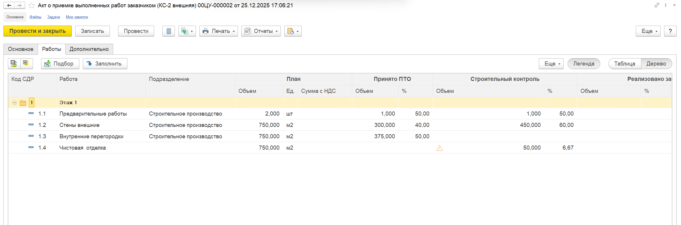 На вкладке «Работы» указывается перечень работ с объемом принятых работ.