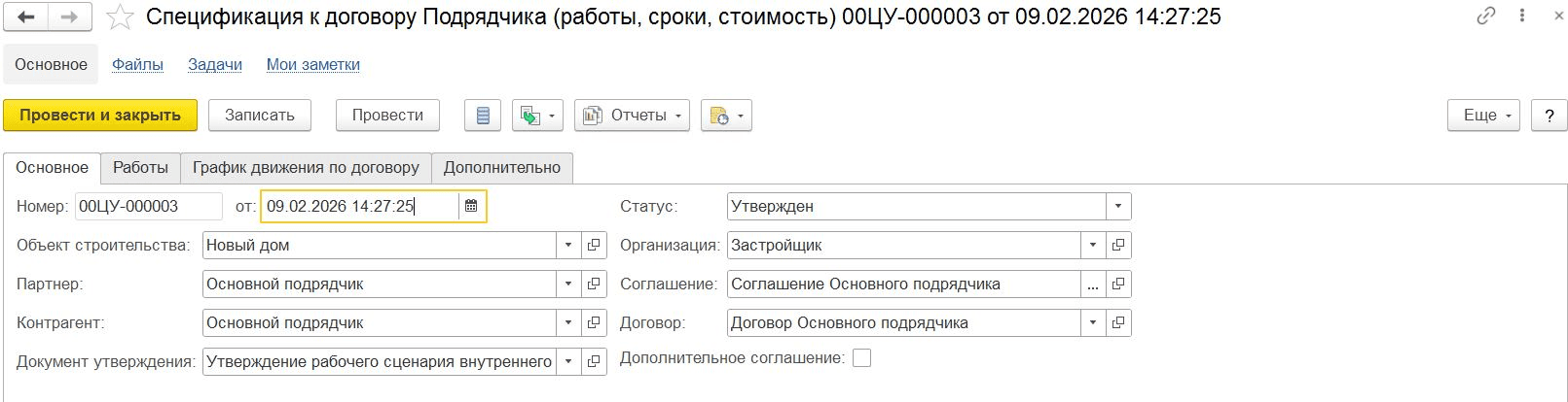 Документ «Спецификация к договору Подрядчика», вкладка «Основное»