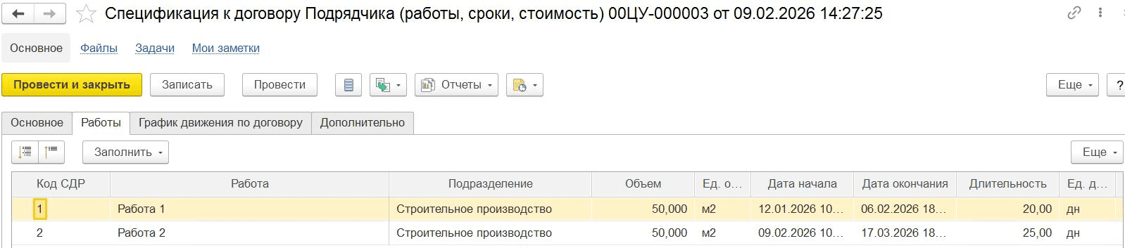 Документ «Спецификация к договору Подрядчика», вкладка «Работы»