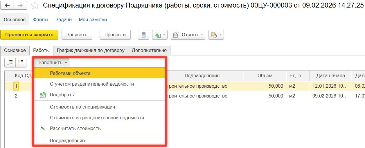Документ «Спецификация к договору Подрядчика», вкладка «Работы», кнопки для заполнения таблицы