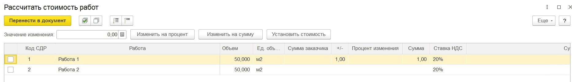 Заполнение стоимости выбранных работ
