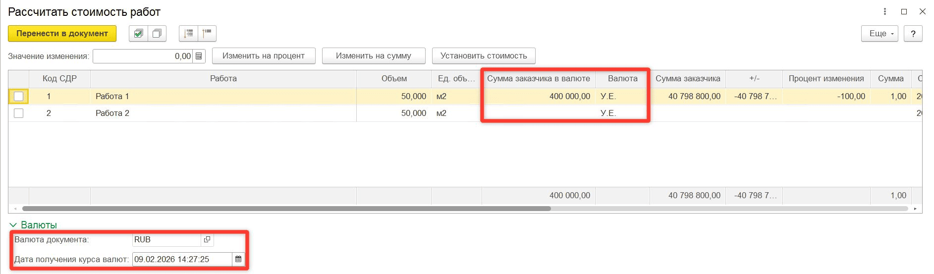 Документ «Спецификация к договору Подрядчика», таблица «Рассчитать стоимость работ», валюты в спецификациях Заказчика и Подрядчика отличаются