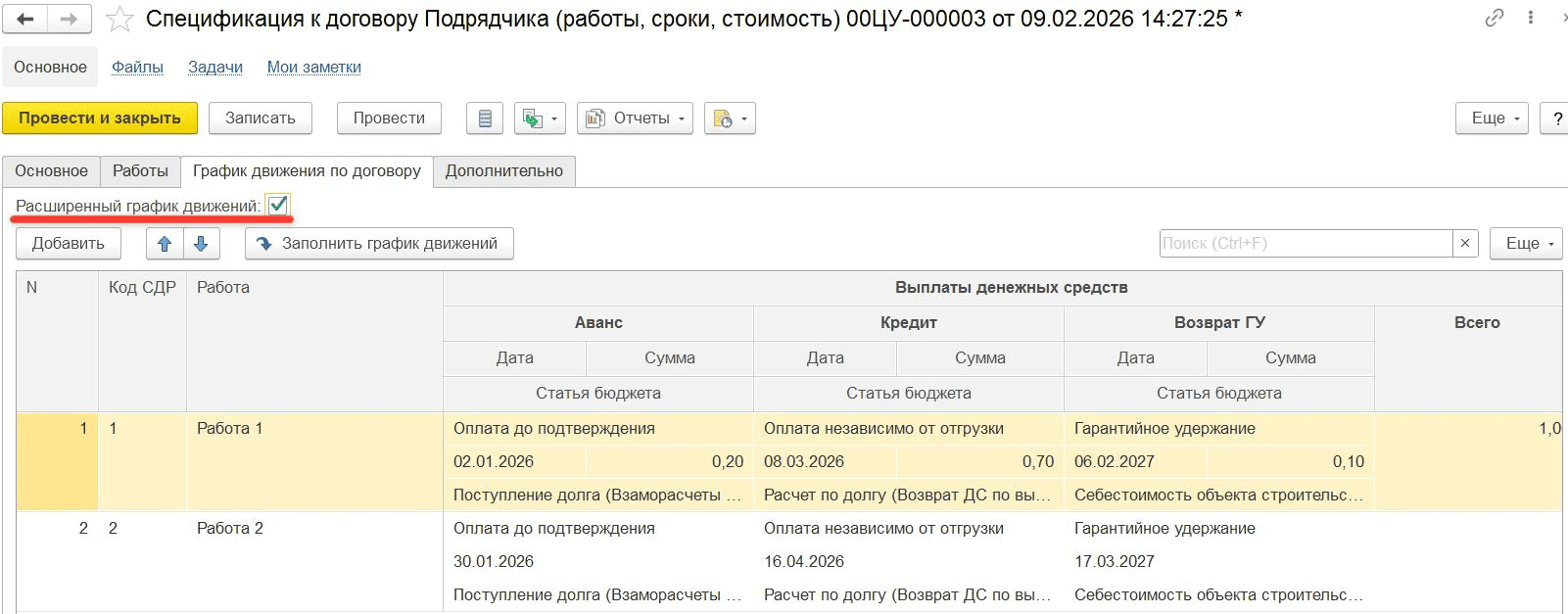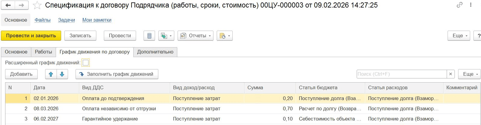 Документ «Спецификация к договору Подрядчика», вкладка «График движения по договору»