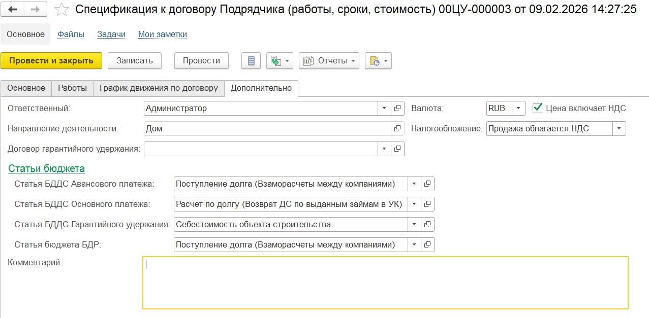 Документ «Спецификация к договору Подрядчика», вкладка «Дополнительно»