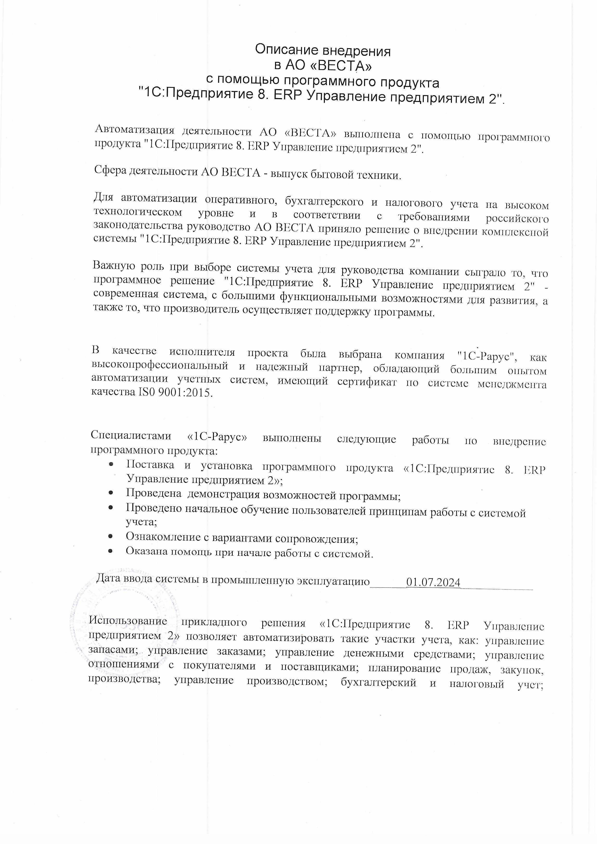 Автоматизация деятельности АО "Веста" выполнена с помощью программного продукта "1С:Предприятие 8. ERP Управление предприятием 2".