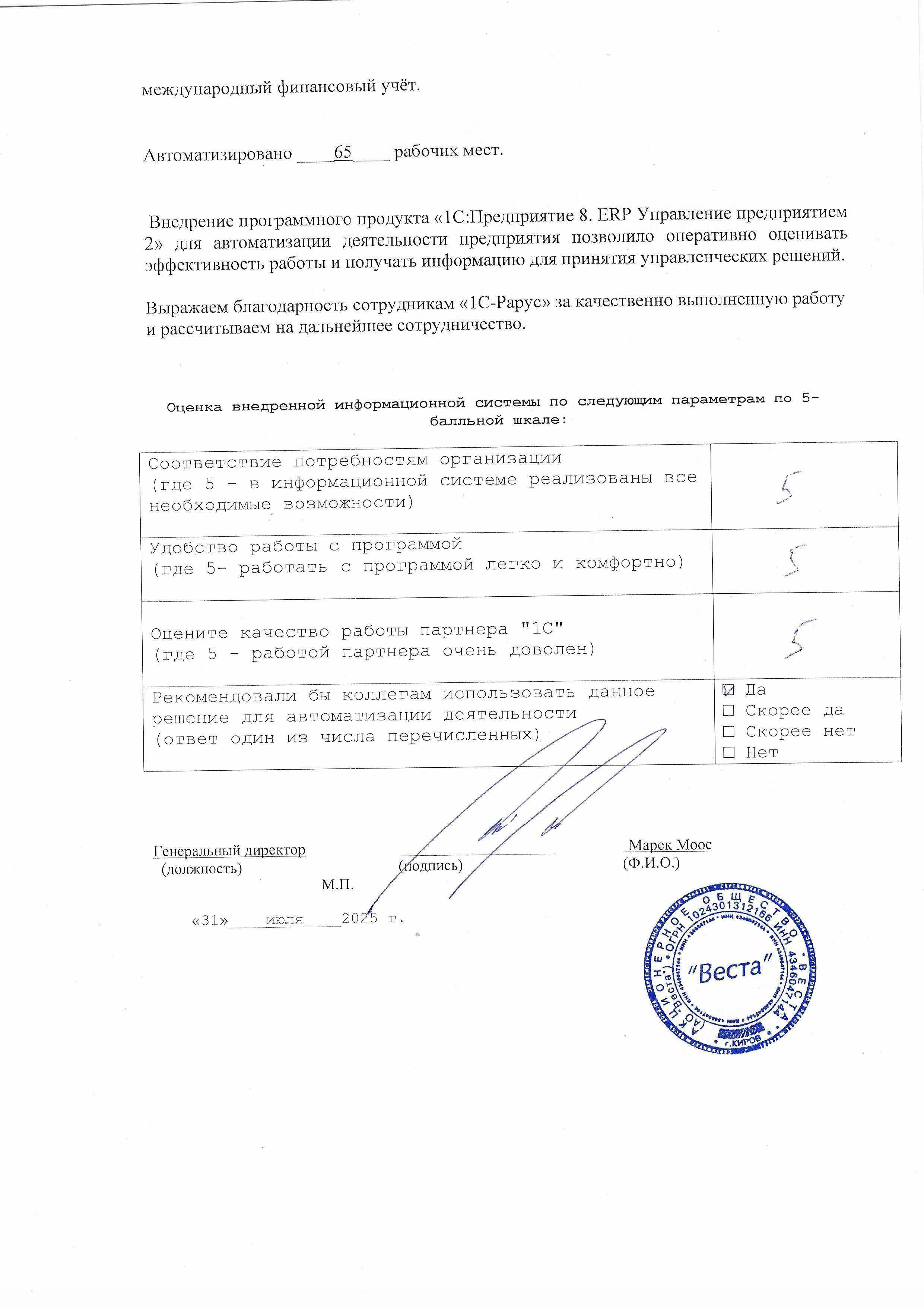 Выражаем благодарность сотрудникам «1С-Рарус» за качественно выполненную работу и рассчитываем на дальнейшее сотрудничество.