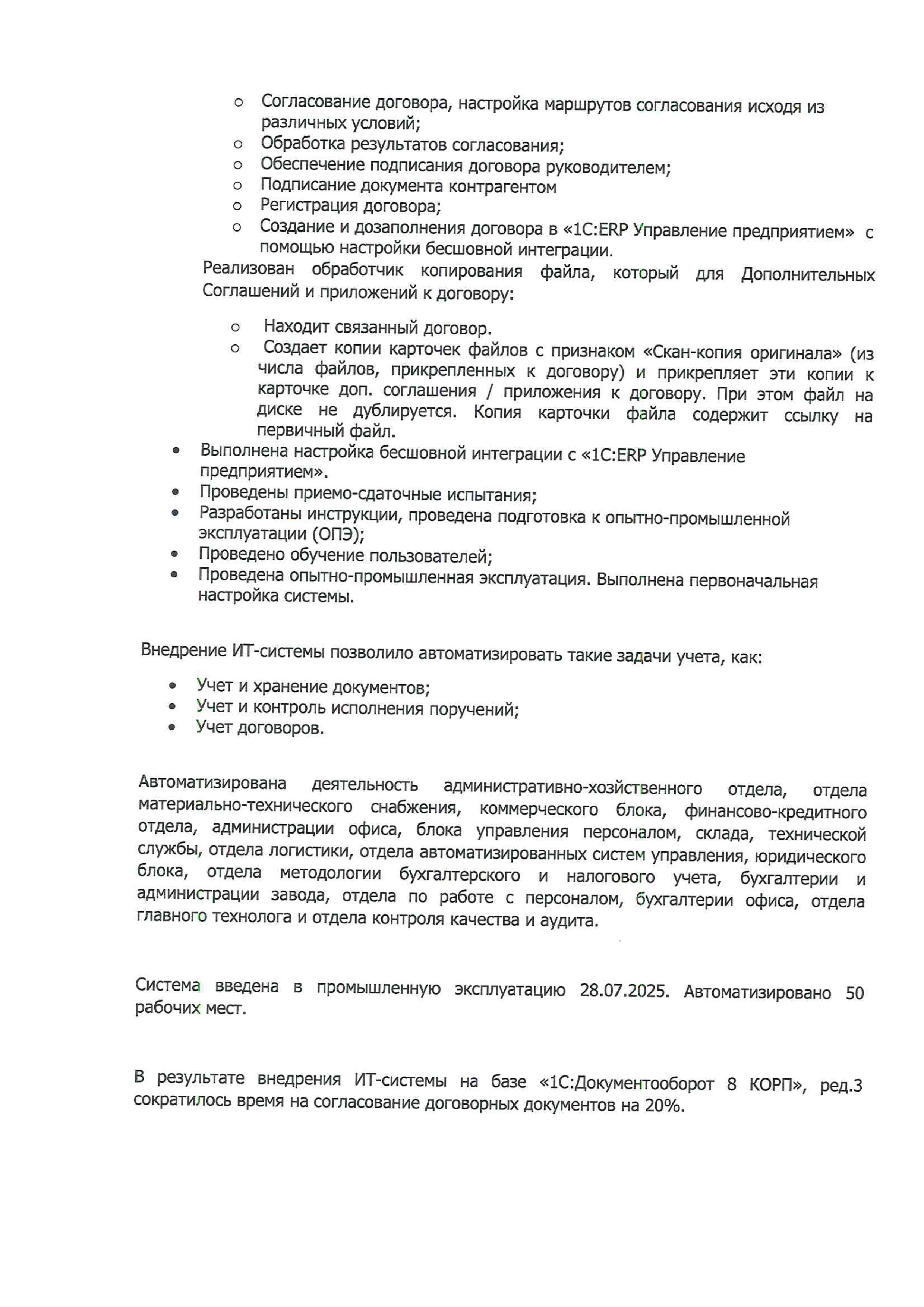 Система введена в промышленную эксплуатацию 28.07.2025. Автоматизировано 50 рабочих мест.