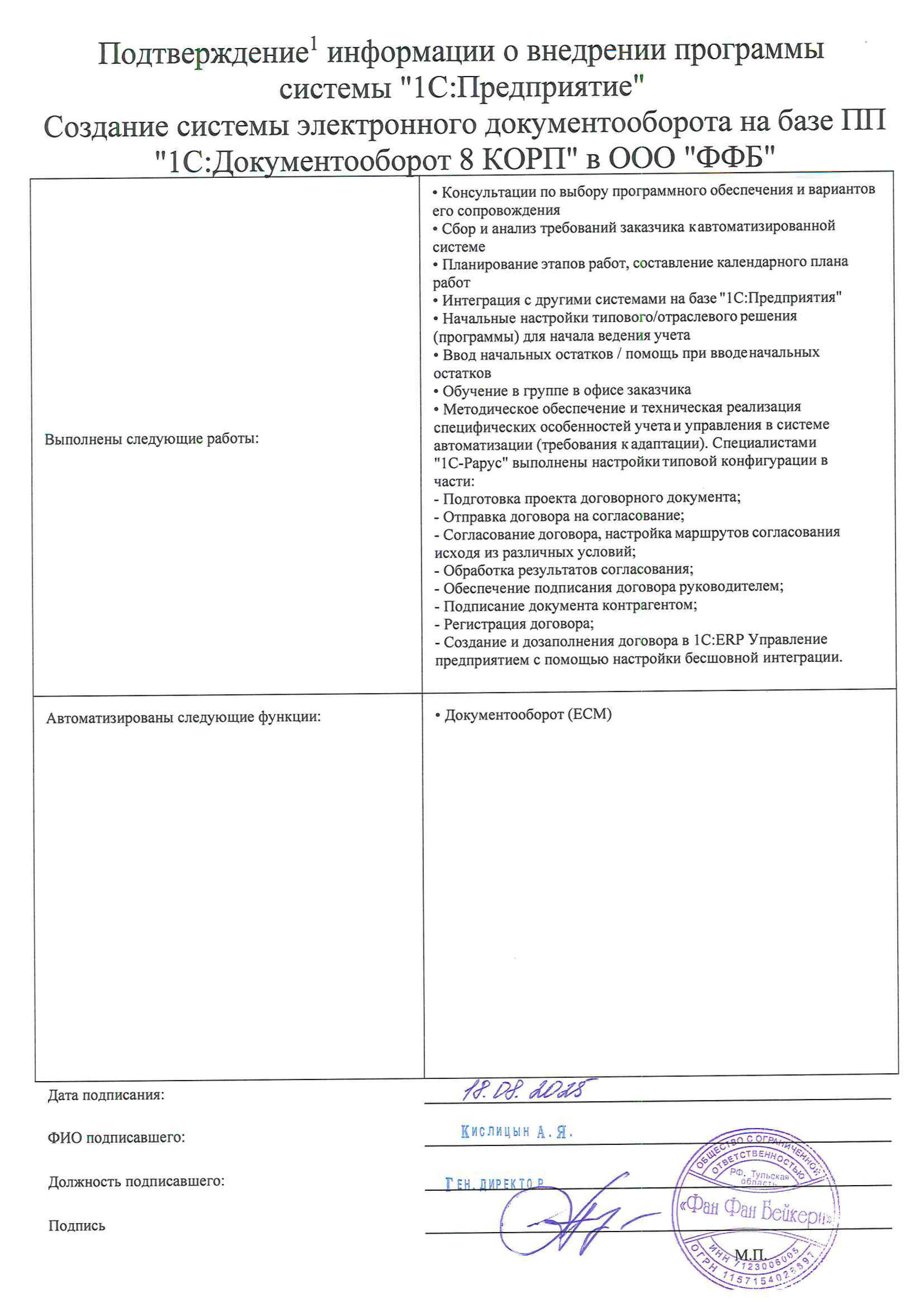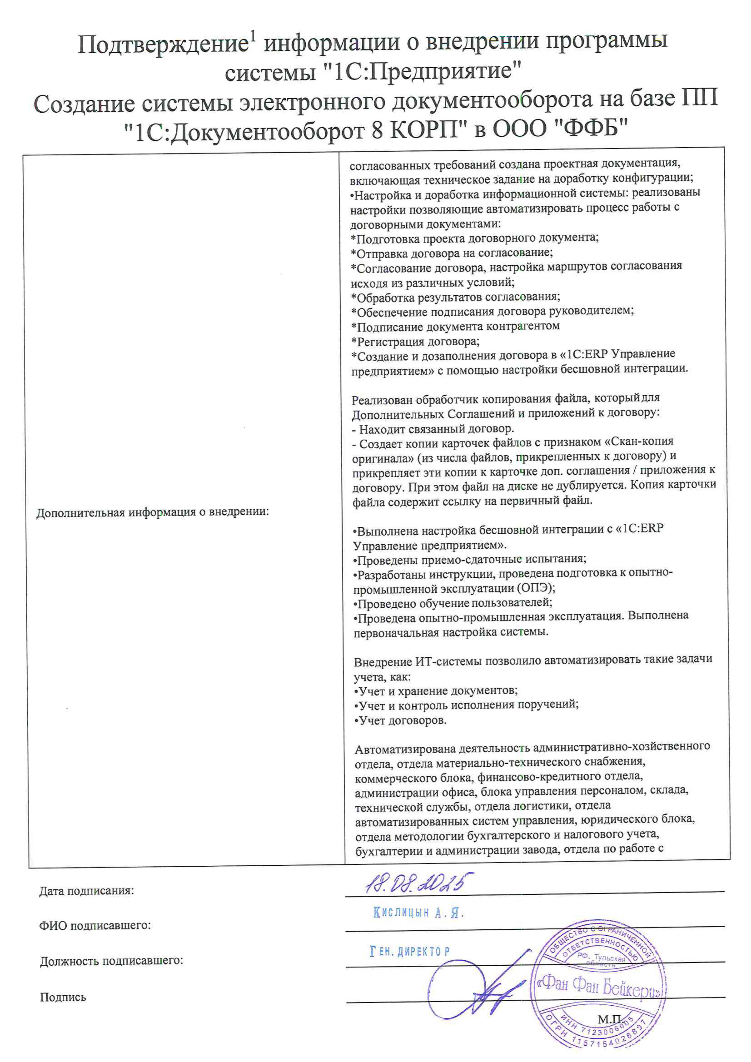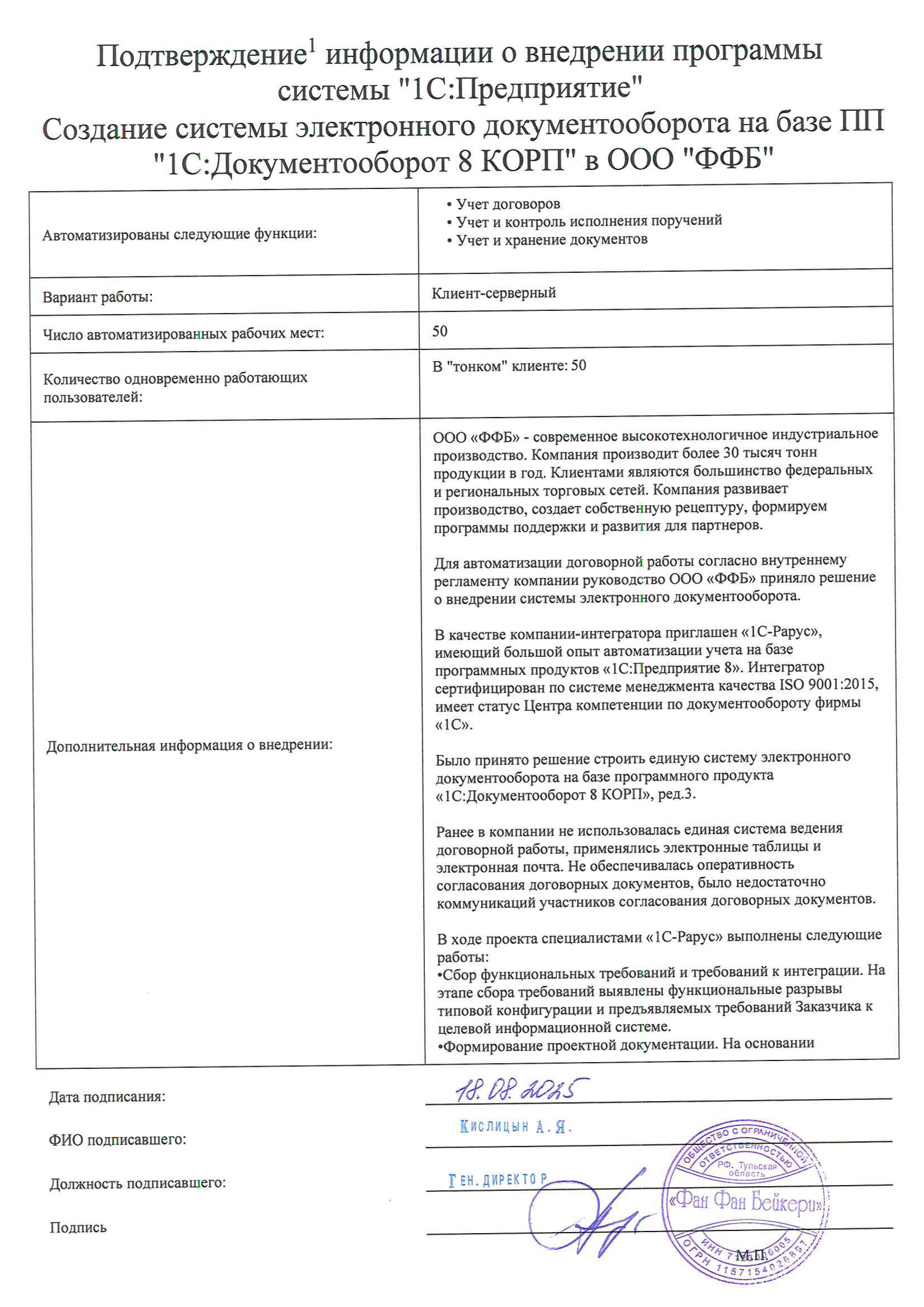 Для автоматизации договорной работы согласно внутреннему регламенту компании руководство ООО «ФФБ» приняло решение о внедрении системы электронного документооборота.